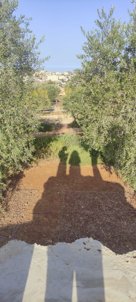 The shadow of artist Nadine Aranki with other museum workers looking at the sea in the distance to which they had no access to due to checkpoints/ movement limitations © Nadine Aranki